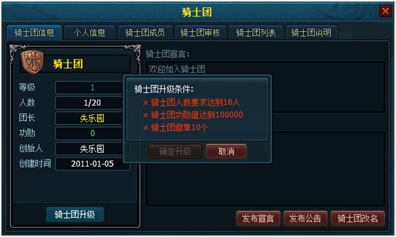 领主等级达到15级,携带并消耗一个骑士团徽章(骑士团徽章可以在杂货店或商城购买)可以创建一个骑士团。