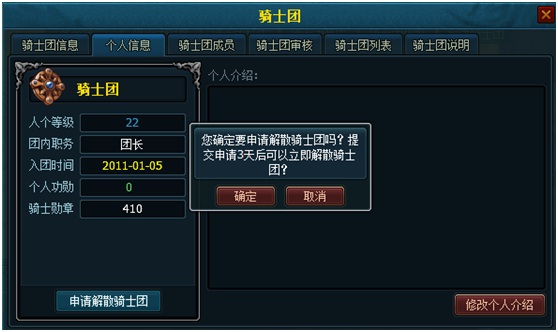 3) 团长接任:团长连续20天不上线,骑士团官员可以申请接任团长。官员提交申请3天后可以点击“接任团长”按钮正式成为团长,原团长则降为普通骑士成员;