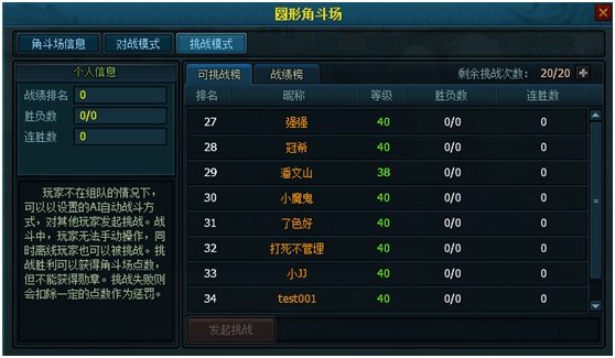 圆形角斗场是为玩家提供多样的竞技挑战体验的娱乐平台,参加圆形角斗场挑战赛可以获得点数和勋章场,达到一定称号等级和勋章可以在角斗场商城购买奖品。