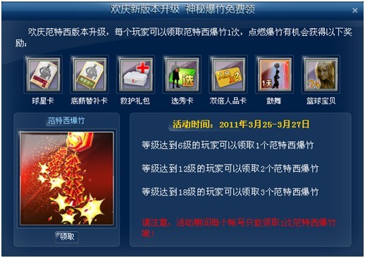 活动规则:活动期间每个账号有一次机会领取范特西爆竹,使用范特西爆竹有机会获得饭票、人品、道具等各项奖励。