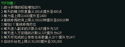 活动期间,点击屏幕左上角头像上方的“VIP”按钮,即可以半价购买《南帝北丐》游戏VIP包月服务、包年服务,VIP月卡仅需150元宝,VIP年卡仅需999元宝!VIP详细功能如下: