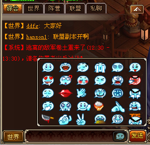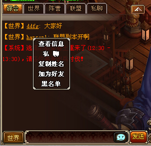 点击图中的“世界”,会弹出频道菜单,可以选择要在哪个聊天频道中发言。 右边是输入框,如图所示,在这里输入消息,按回车键或者点击发送按钮即可把消息发送出去。