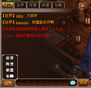 频道包括:世界频道,阵营频道,联盟频道,私聊频道