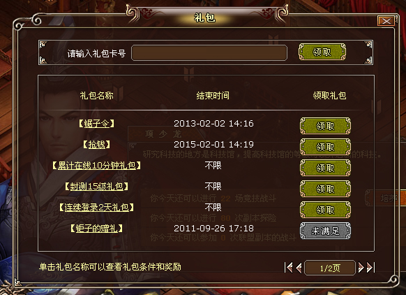 达到领取条件的礼包可以点击领取按钮直接领取。点击礼包名称可以查看礼包的领取条件。