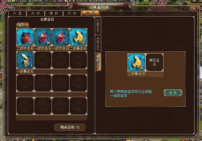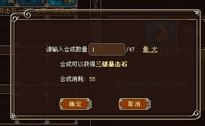所有和装备打造的宝石包括升星宝石、洗炼宝石和镶嵌宝石都可以用低级宝石合成为高级宝石。合成的时候需要两个相同的低级宝石,在消耗刀币后可以获得一个高一级的同类型宝石。