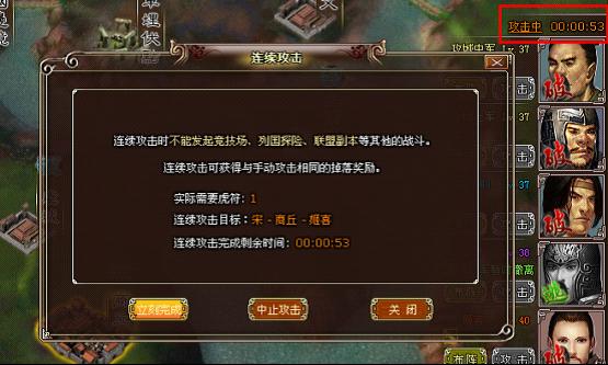 3、连续攻击不消耗士兵,但需要消耗虎符和消耗一定的时间,1次攻击消耗1个虎符和1分钟。