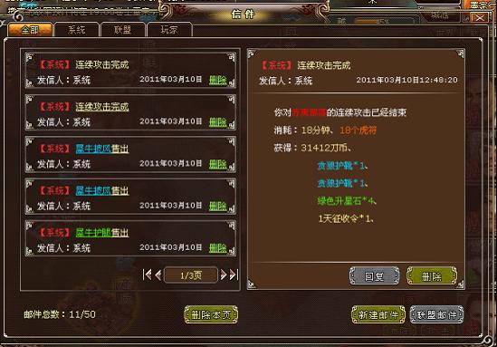 4、完成连续攻击后,会有提示和邮件告诉你攻击完成的收获。