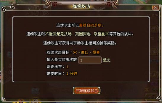 1、连续攻击是对指定的一个敌人自动进行多次的攻击,可以离线完成。