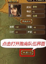 小提示:队伍里相同相性的效果是不会叠加的,所以尽量组上有不同相性的队伍吧。加入队伍之后就不能更改武将了,所以要在加队伍或者建队伍前想要你要跑商的武将。