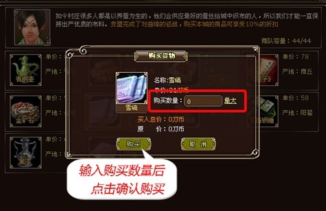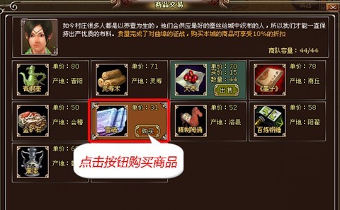 b) 在城池界面中找到这个城池贩卖的商品,红色底图,然后点击【购买】按钮。