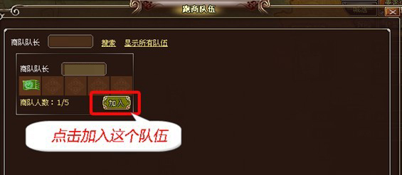 c) 如果你想加入一个队伍,可以打开跑商队伍的界面去找一个合适的队伍申请加入。