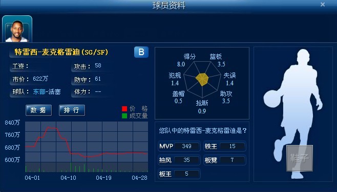 作为联盟目前现役的球员,无论是在NBA还是在《范特西篮球经理》里,麦迪依然是一位实用的球员。场均依然能得到8分,3.5个篮板和3.5个助攻,平均有0.9个抢断,失误和犯规都仅仅只有1.4,相当稳定和实用。