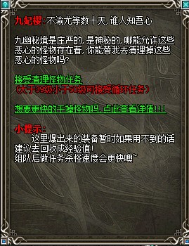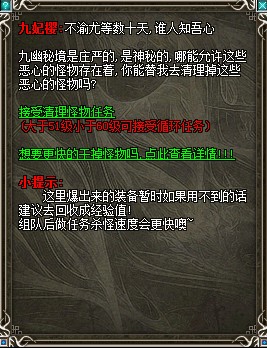 大家进入九幽秘境的地图,都会有对应等级的npc接到杀怪任务,任务会送出丰厚的经验奖励。