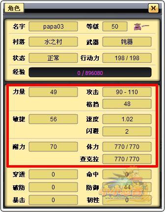 攻击属性:分为最大最小攻击,实际攻击值在最大最小值之间随机抽取,影响角色人物对对手造成的伤害值。