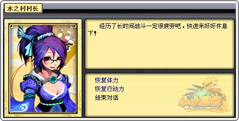 2、城中大厅:可在游戏各个主城中的大厅中,进入休息间,点击恢复体力,进行体力和查克拉的恢复。