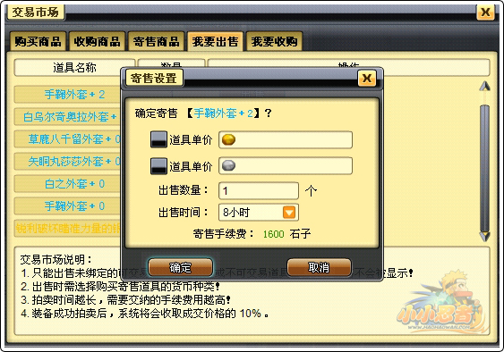 寄售商品列表中,将以出售时间从前往后排序出售中的道具。并显示道具的名称、数量、单价、挂单剩余时间以及相关功能操作。玩家可以在此界面中选择展示或者下架。选择展示则可以将此物品的超链接展示在世界频道,而点击下架,则取消此单出售,同时,手续费将不予返还。