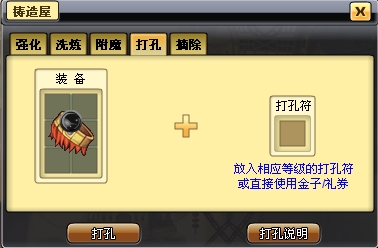 放入需要打孔的装备后,点击"打孔"按钮,即可进行打孔。每次打孔需要消耗金子或者礼券。打孔后,装备属性描述上会出现已打孔数,同时,鼠标移动到装备上时可以看到孔的效果。