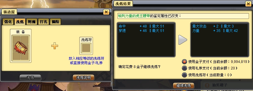 放入需要洗炼的装备后,点击"洗炼"按钮,即可进行洗炼。每次洗炼需要消耗金子或者礼券。洗炼后,装备的品质属性会重新进行生成,但是装备的品质保持不变。洗炼后,在洗炼结果面板中可以查看洗炼前和洗炼后的品质属性。玩家若是对洗炼后的属性不满意,可以选择继续洗炼。