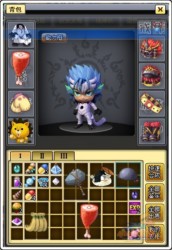 背包除去普通的存放物品等作用外,还拥有穿戴装备、快速合成、全部鉴定、全部出售、全部卸下等功能。