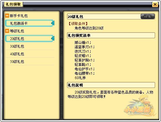 礼包分为2种领取方式: 1、需要通过礼包激活卡激活:玩家点击“礼包”即可弹出礼包界面,如果玩家拥有礼包激活卡,便点击礼包激活卡,输入激活码,即可领取礼包。 2、无需激活卡礼包:此类礼包,只要玩家满足领取条件,即会在“礼包”按钮高亮闪烁提示,玩家点击进入即可领取。