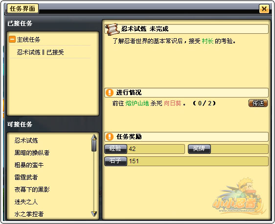 进入游戏界面,在游戏下部导航栏中点击“任务”就可进入任务界面,对当前任务经行查询,包括已接任务中的,未完成任务与完成任务,另外还显示可接任务,并提供人物的传送链接与任务详细说明。 玩家可以通过观察任务界面,对自己已经接受的任务和未接受的人物经行详细了解,为玩家了解游戏,提供了方便。