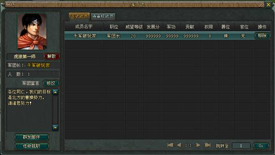 军团长:1名。拥有任免副军团长,接受团员,开除团员,邀请他人加入军团,发布军团信件的权限。
