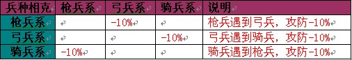 答:幻想三国的兵种相克规则是:枪兵克骑兵,骑兵克弓兵,弓兵克枪兵。
